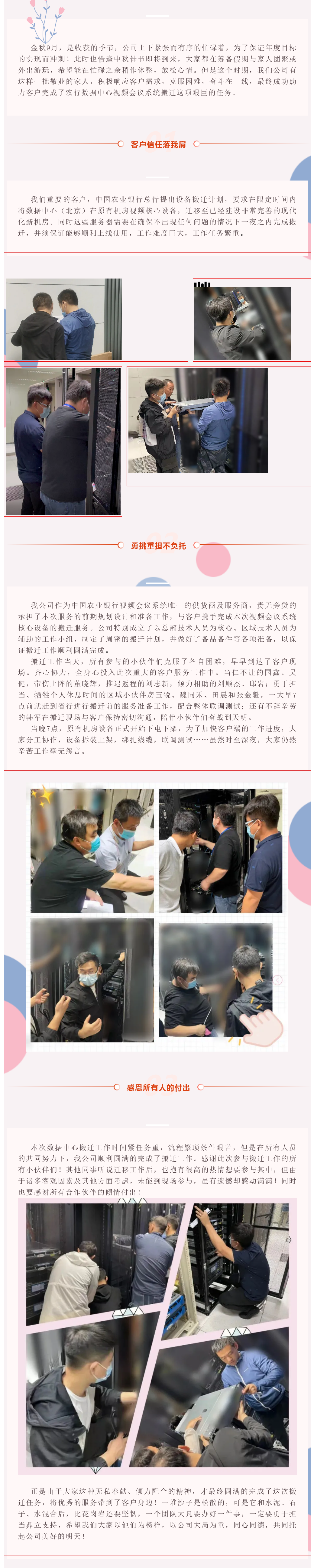 本次數(shù)據(jù)中心搬遷工作時(shí)間緊任務(wù)重,流程繁瑣條件艱苦,但是在所有人員的共同努力下,我公司順利圓滿的完成了搬遷工作。感謝此次參與搬遷工作的所有小伙伴們!